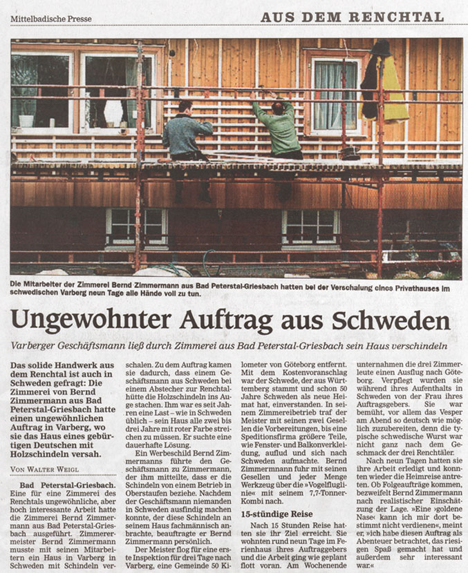 Einen ungewöhnlichen Auftrag hatte die Zimmerei Bernd Zimmermann vor einigen Jahre erhalten: Ein Haus in Schweden sollte wie am Beispiel der Renchtalhütte mit Holzschindeln versehen werden. Dazu kam es, da der aus Deutschland stammende Hausbesitzer in der Nähe von Göteborg nicht immer ständig sein Holzfassade alle paar Jahre streichen wollte und diesem die Schindelverkleidung bei der Renchtalhütte so gut gefiel, dass er somit den Auftrag an die Zimmerei Bernd Zimmermann vergeben hat – in Schweden konnte er hierzu niemanden ausfindig machen.